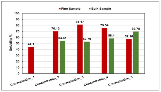 The solubility test was performed for the fine-scale sample of five mesh sizes with a nominal sieve opening of 4.0 mm. The same procedures were conducted for the mesh size scale samples as for the bulk sample. However, the solid to liquid ratio was 2.0 g from the fine-scale to 20 mL from the new scale dissolver. The solid to liquid ratio is considered an important factor in the solubility design [21,48]. The solid amount represents how much of the scale was deposited and plugged the internal pipeline capacity for the fluid flow. The scale density and volume of the internal tubular diameter are used together to determine the scale solid weight that has to be removed using the scale dissolver [16,49]. The volume of the scale dissolver is determined from the dissolution efficiency within the solubility test. A lower amount from the scale dissolver is better from an economic point of view [5].