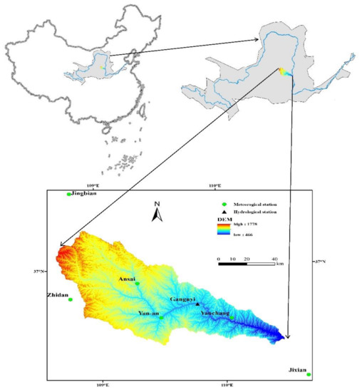 The Yellow River Conservancy Commission (YRCC) provided annually observed runoff discharge, and sediment load data at the Ganguyi station (1956–2016). Meteorological data from six weather stations in the Yanhe River watershed from 1956 to 2016 were obtained from the China National Meteorological Information Center (http://cdc.cma.gov.cn/home.do). The inverse distance weight interpolation (IDW) method for the weather station was applied to obtain the watershed climate information. Land use data was provided by the Chinese Academy of Sciences Resource and Environment Science Data Center. Vegetation coverage and DEM were provided by Geospatial Data Cloud site, Computer Network Information Center, Chinese Academy of Sciences. (http://www.gscloud.cn). Vegetation coverage is extracted from theGIMMS (glaobal inventory modelling and mapping studies) NDVI (normalized difference vegetation index) and MODIS (moderate-resolution imaging spectroradiometer) NDVI data sets (http://globalchange.nsdc.cn). The vegetation coverage in 1980 was linearly calculated based on the vegetation coverage in 1981–2016. Data on cultivated area, human population size and economic data, which are supported by the Yanhe River watershed, have come from several statistics yearbooks, including the Shannxi Statistical Yearbook (http://cnki.netdata.cn) and the Yanan Statistical Yearbook (http://dfz.shaanxi.gov.cn).