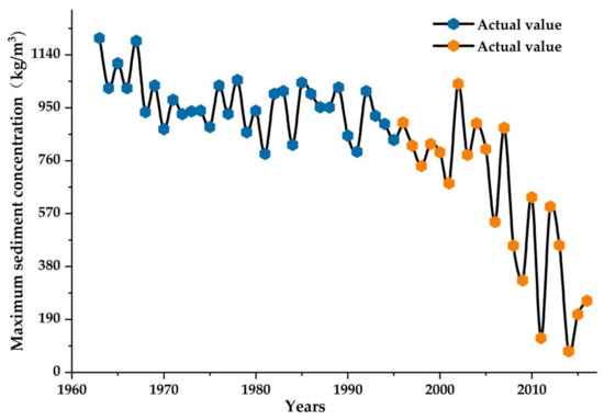 Runoff sediment concentration is an important parameter that must be measured in soil and water conservation monitoring. Figure 4 shows the change of maximum sediment concentration in Yanhe River watershed from 1963 to 2016, and the maximum sediment concentration generally occurs in flood season. It can be seen that before the change, the fluctuation of the maximum sediment concentration was stable, while after the change, the maximum sediment concentration decreased significantly, and the fluctuation was large. The maximum value was 1200 kg/m3 in 1963, and the minimum value was 75.9 kg/m3 in 2014. The average annual maximum sediment concentration decreased from 959.5 kg/m3 to 595.1 kg/m3.