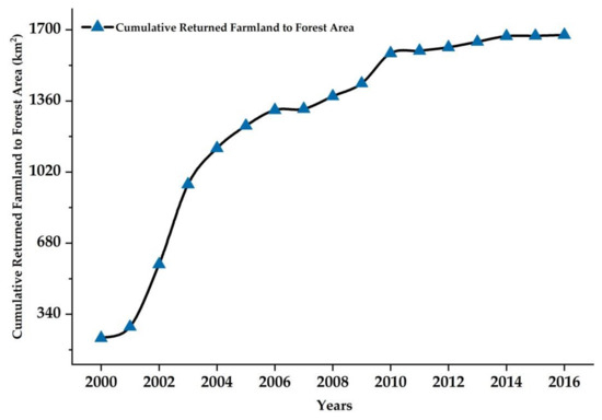 In recent centuries, unsustainable cultivation and grazing in extremely hilly areas have transformed most of the arable land in the loess plateau (up to 70%) into degraded land [47]. In order to address the serious land degradation problem, the Chinese government (since 1999) initiated a program the Grain for Green on the loess plateau, giving priority to action to address large-scale soil erosion [48]. Figure 5 shows the area of the Yanhe River watershed that has been converted to forest since 1999. It can be seen that the implementation process of “Grain for Green” in the Yanhe River watershed presents three stages—first slowly increasing, then accelerating, and finally approaching equilibrium. From 2000 to 2016, a total of 1675 km2 of farmland in the Yanhe River watershed was converted into woodland, with an annual average conversion rate of 98.5 km2. The implementation of the policy of returning farmland to forests has changed the land use types in Yanhe River watershed. Table 2 shows land use types from 2000 to 2015 obtained by remote sensing image classification of the Yanhe River watershed. As can be seen from the table, the cultivated land area of Yanhe River watershed continuously decreased from 3217 km2 to 2360.5 km2 from 2000 to 2015. The area of woodland, grassland and urban construction land increased continuously, with an increase of 263.5 km2 of woodland, 539.5 km2 of grassland and 54 km2 of urban construction land.