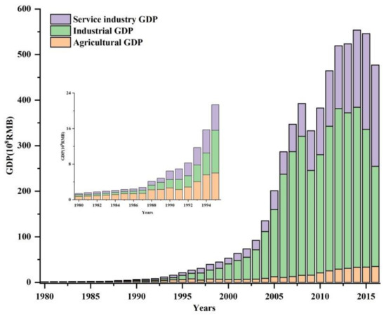The Chinese government introduced a reform and opening-up policy in 1978 to promote rapid economic development in China [49]. This paper chooses the Yanhe River watershed from 1980 to 2016, such as industrial production value, population, urbanization, and other social indicators to represent the economic development of the river basin. Figure 6 is the distribution of Gross Domestic Product (GDP) in various industries in the Yanhe River watershed. It can be seen that the GDP of the Yanhe River watershed has continued to rise, from 0.02 × 109 USD in 1980 to 6.89 × 109 USD, of which industrial GDP has increased from 0.56 × 107 USD rose to 3.17 × 109 USD, the service industry increased from 0.38 × 107 USD to 3.21 × 109 USD, and the agriculture increased from 0.01×109 USD to 0.51 × 109 USD. Since entering the 21st century, with the rapid development of industry and service industry, the total GDP has increased from 0.17 × 109 USD∙yr−1 by 4.62 × 109 USD∙yr−1. The proportion of industrial GDP in the basin’s GDP increased from 27.9% to 46%, the proportion of the service industry increased from 19.7% to 46.6%, and the proportion of agricultural GDP in the basin’s GDP decreased from 52.26% to 7.4%.