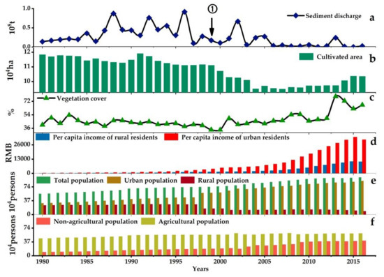 Comprehensive of factors in the Yanhe River watershed from 1980 to 2016. (a) Sediment charge; (b) cultivated area; (c) vegetation cover; (d) urban per capita income and rural per capita income; (e) total population, urban population, and rural population; (f) agricultural population and non-agricultural population ①: Grain for Green Project.