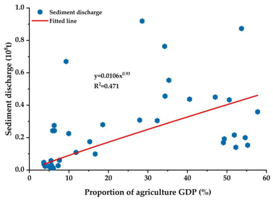 Relationship between the ratio of agricultural GDP to total GDP and annual sediment discharge in tons/year.