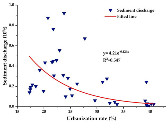 Relationship between urbanization rate (household register) and annual sediment discharge in tons/year.