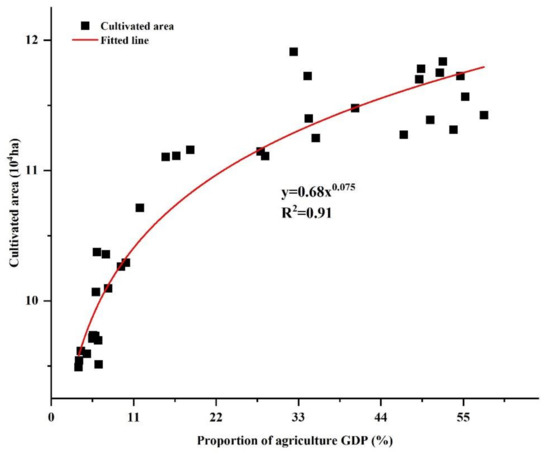 Relationship between the ratio of agricultural GDP to total industrial GDP and cultivated area.