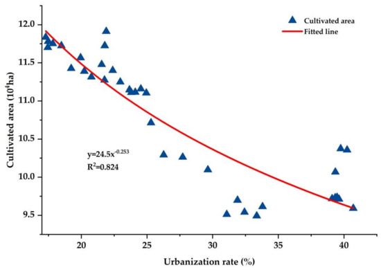 According to the above analysis, the ratio of agricultural GDP to total GDP, urbanization rate, and cultivated land area and sediment loads were regressed, as shown in the Figure 8, Figure 9 and Figure 10. As can be seen from Figure 8, there is a significant positive correlation between sediment loads and the ratio of agricultural GDP to total GDP (p < 0.01, indicates a significant level of confidence at 0.01), and the correlation coefficient is 0.471. As the proportion of agricultural GDP decreases gradually, the sediment loads decrease gradually. Figure 9 shows the relationship between urbanization rate and sediment loads. It can be seen from the figure that the higher urbanization rate is, the lower sediment loads. There was a significant negative correlation between urbanization development and sediment loads (p < 0.01), and the correlation coefficient was 0.547. It can be seen from Figure 10 that the smaller the area of cultivated land, the less the amount of sand transported. Cultivated land area was positively correlated with sediment loads (p < 0.01), and the correlation coefficient was 0.43. The lower correlation coefficient was mainly due to the fact that the cultivated land area adopted in this paper was the common cultivated land area, not the main cultivated land area converted to forest or reduced.