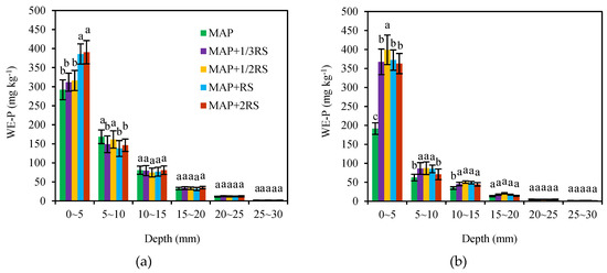 The maximum values of AE-P also occurred at the 0–5 mm soil section in either of the two soil types (Figure 3). Within a distance of 0–5 mm from the fertilizer site, the AE-P concentration was much higher than that in the other distances. With increasing distance from the fertilization site, the AE-P content decreased rapidly. This result indicated that the applied phosphorus was severely precipitated within 5 mm of the fertilizer site. In detail, the AE-P concentrations within the 0–5 mm soil section were 575.47–678.18 mg·kg–1 in the latosolic red soil, and the MAP + 1/2RS concentration was the highest. However, the AE-P concentrations decreased to 258.41–288.79, 113.88–125.98, 42.41–51.71, 13.97–19.76, and 3.02–4.43 mg·kg−1 in the 5–10, 10–15, 15–20, 20–25, and 25–30 mm soil sections, respectively. In the fluvo-aquic soil, the AE-P contents in the 0–5 mm soil sections was 1221.18–1364.91 mg·kg−1. The AE-P value of the MAP treatment was much higher than those of the other treatments with the addition of the RS, while the WE-P concentration was much lower. In the 0–5, 5–10, and 10–15 mm soil sections, the AE-P values of the MAP were 8.30–11.77%, 10.61–16.36%, and 4.39–18.98% higher than those of the other treatments, respectively.
