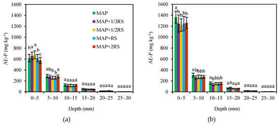 Distribution of the AE-P in the latosolic red soil (a) and fluvo-aquic soil (b) with the different addition levels of RS. MAP, MAP + 1/3RS, MAP + 1/2RS, MAP + RS and MAP + 2RS represent treatments monoammonium phosphate alone or in combination with 0.016 g RS, 0.024 g RS, 0.048 g RS and 0.096 g RS, respectively. The different lowercase letters indicate significant differences in AE-P concentration among the different RS addition levels in each soil section (p < 0.05).