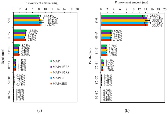 Movement of P from fertilizer in the latosolic red soil (a) and fluvo-aquic soil (b) with different RS addition levels. The different percentages indicate the percentage between the P movement in each soil section and the total fertilizer P. MAP, MAP + 1/3RS, MAP + 1/2RS, MAP + RS and MAP + 2RS represent treatments monoammonium phosphate alone or in combination with 0.016 g RS, 0.024 g RS, 0.048 g RS and 0.096 g RS, respectively.