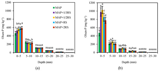 Similar to WE-P, the Olsen-P distribution in the columns was affected by amount of RS added and the distance from the fertilizer site (Figure 5). The maximum Olsen-P concentration occurred in the 0–5 mm soil section from the fertilizer site both in the latosolic red soil and fluvo-aquic soil. With increasing distance from the fertilization site, the content of Olsen-P decreased rapidly. The Olsen-P concentrations were 464.16–589.03 mg·kg−1 in the 0–5 mm soil section in the latosolic red soil and increased with the increasing of RS addition. However, in the 5–10 mm soil section, the Olsen-P concentration of the MAP treatment was the highest. In the fluvo-aquic soil, the Olsen-P concentrations of the treatments that were added RS were significantly higher than that of the MAP treatment, and the maximum value occurred in the MAP + 1/2RS. The diffusive movement of Olsen-P in the 10–30 mm soil section was very limited and did not change much with the amount of RS added.