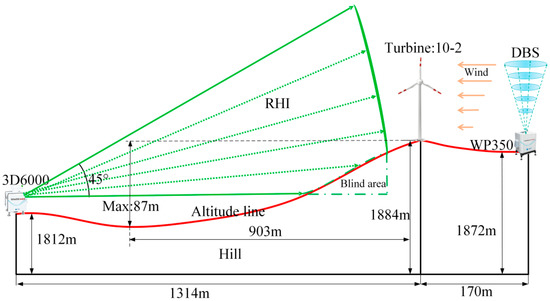 The target wind turbine 10-2 is located at the northern edge of the wind farm. There is no wind turbine wake interference within a range of 1000 m upwind and downwind, which is suitable for wind turbine wake observation. By analyzing the data of the wind measurement tower provided by the wind farm in the past three years, it is concluded that the prevailing wind direction during the experimental period is northwest [34]. Based on this, WP350 is located 170 m northwest of the wind turbine to provide the incoming wind data and 3D6000 is located 1314 m southeast of the turbine 10-2, which ensures that the RHI mode can accurately obtain the turbine 10-2 wake data under the prevailing wind direction. At the same time, it can be seen from Figure 2 that the connecting distance between 3D6000 and turbine 10-2 is 1314 m (about 17D, D is the rotor diameter of the wind turbine, 77 m) and the maximum altitude difference between the two is 87 m, which is suitable for observing the characteristics of wake development under the influence of topographic effects. In addition, in order to obtain the high-resolution incoming wind profile and wake speed distribution as accurately as possible, the measurement heights of WP350 are from 65 m to 350 m above the ground with an interval of 10 m, and the radial range resolution of 3D6000 is set to 20 m (Range Resolution, the minimum distance that line segment AB can distinguish along the projection direction of the LiDAR beam on the ground), which can be seen in Table 1 for the setting parameters of two LiDAR methods in this experiment.
