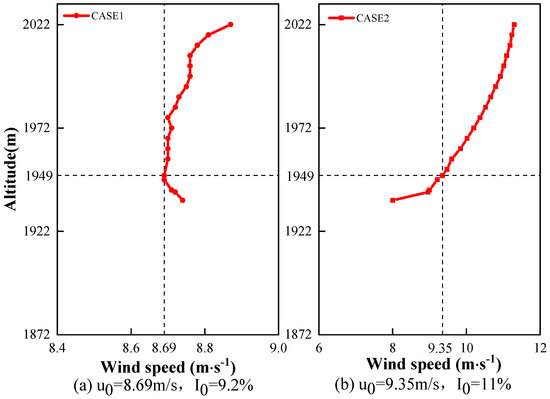 Due to the existence of the wind shear effect, the incoming wind speed for the two cases increases with the height away from the ground. In addition, the incoming wind speed and turbulence intensity at hub height of Case 2 in Figure 3b are significantly higher than those of Case 1 in Figure 3a. The corresponding wind shear effect is also more obvious, which is approximately exponentially distributed. Considering the effects of complex terrain and high altitude, the wind shear effect measured in this experiment is significant.