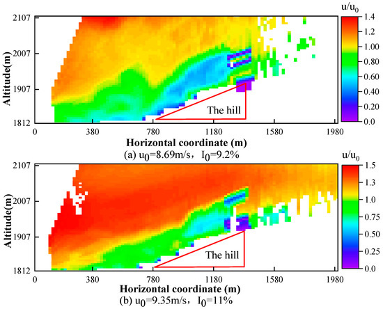 The wake distribution of the horizontal wind speed at the vertical height planes under two different incoming wind conditions is shown in Figure 4a,b, respectively. Note that in Figure 4, there is no wind data in red triangle area due to the occlusion of the ridge and the laser beam emitted by the LiDAR. The wind turbine is located at a position of 1314 m, and the vertical axis represents the altitude. The wake behind the turbine is obvious and a recovery is observed with the increase of the downwind distance.