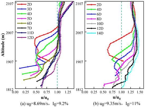 The inflow wind profile under two different incoming wind conditions are shown in Figure 3a,b, respectively (Case 1: u0 = 8.69 m/s, I0 = 9.2%; Case 2: u0 = 9.35 m/s, I0 = 11%, and the meaning of these abbreviations can be found in Appendix B). It can be checked that with the increase of altitudes, the wind speed increased. However, the trends are different, which produce two different incoming wind profile shapes and thus, have different effects on the wake profiles. The impact of incoming wind profiles on wake velocity distribution is shown in Figure 4 and Figure 5 with corresponding analysis.