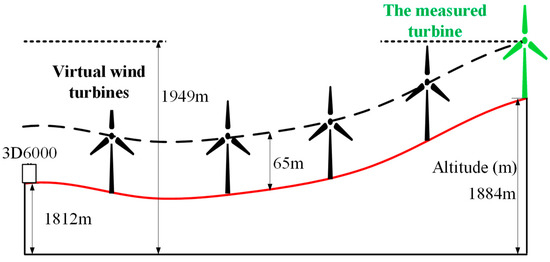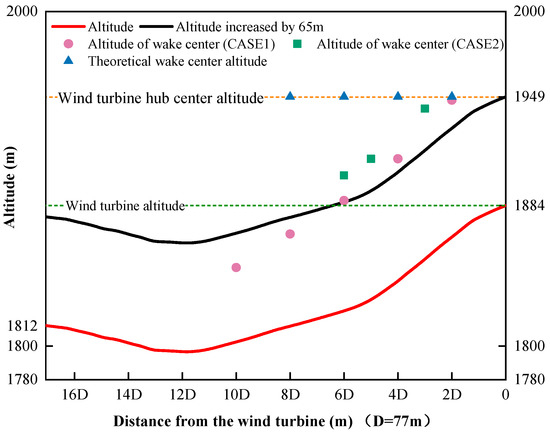 In flat terrain wind farms and offshore wind farms, due to the small effect of wind shear, many scholars assume that the wake speed exhibits a self-similar Gaussian distribution in the research of the wake characteristics, which means that the wake centerline is near the hub height [35,36]. However, in complex terrain wind farms, especially those with large elevation differences, the topography fluctuation will make the wake center sink, and then change the distribution of wind speed in the wake area. In our experiment, there is a slope down behind the turbine and the altitude difference between the 3D6000 and the wind turbine is 77 m. The slope is 10° (tanα = H/L). Observing from Figure 4 and Figure 5, the center of the wake sinks significantly along the ridge. To characterize the relationship between the descending height of the wake center and the altitude drop caused by the terrain effect, the centerline of the wake is captured. Figure 6 shows the altitude differences between the wake centerline of turbine 10-2 and 3D6000. The solid red line in the figure is the altitude measured by Google Maps which is also the surface of the hill behind the turbine. The black dashed line is the imaginary line of turbine’s hub heights. It can be concluded that the altitude line is translated upward by 65 m, which is the hub height of the turbine.