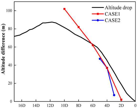 To make it clearer, Figure 8 shows the altitude differences at different downwind distances. In Case 2, the maximum altitudes difference occurs at 10D, which is about 20 m. At 6D, the descending height of the wake center is basically consistent with the corresponding altitude difference. In addition, sinking trend in Case 1 was basically consistent with that in Case 2. Based on the above analysis, it can be concluded that the sinking height of the wake center in the complex terrain wind farm has a linear correlation with the altitude difference.