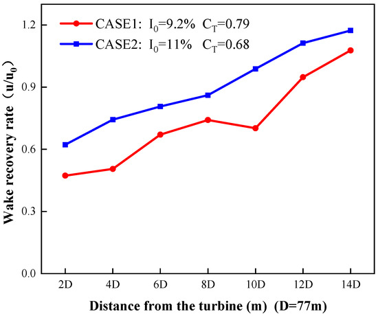 In Section 3.1 and Section 3.2, the influence of wind shear effect on wake speed distribution shape and the influence of topography on wake subsidence are analyzed, respectively. In this part, the effect of incoming wind conditions on wake recovery rate is further explored. Figure 9 shows the recovery rate of wake center at different positions in the wake region of turbine 10-2 under the two Cases (Inflow conditions: I0 = 9.2%, CT = 0.79 in Case 1 and I0 = 11%, CT = 0.68 in Case 2). It can be seen that the wake recovery rate of Case 2 is significantly higher than that of Case 1 and the difference between the two cases gradually decreases as the increase of the downwind distance. Regarding the explanation of wake recovery phenomenon, classical literature [37] pointed out that the turbulence in wake region could accelerate the wake recovery rate, which was generated due to the convection of wake and free incoming wind. Based on the above analysis, it can be concluded that the turbulence intensity in the wake region of Case 2 is higher than that of Case 1.