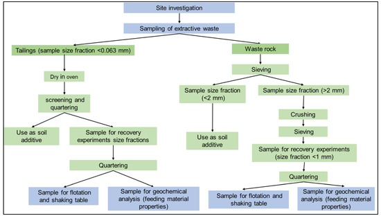 The methodology followed (Figure 1) in this research consists of investigations, processes, and characterization steps, which can be replicated in similar case studies (Zn-Pb mining sites, but also extractive waste facilities at large). It can be considered an interdisciplinary approach to EW management and recovery in the view of a landfill mining approach. In particular, the steps followed during the research activity are: