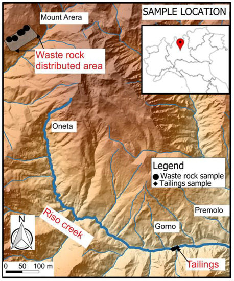 The sampling was performed in dumps placed at Mount Arera (Figure 3) following site investigation and sampling activities described in Dino et al. [33] and here briefly reported. The WR dumps at Mount Arera are spread uniformly with thickness of c. 2 m. Waste rock material was sampled using a hand shovel and/or a hammer. Each sample (8–10 kg) was collected by recovering four subsamples from the vertices of a 2 m × 2 m square, and mixing these together after removing organic residues. In total, 30 samples of waste rock were collected at the site in June 2016. Tailings deposit was near the Riso creek and covered with thin layer of soil of 20–40 cm; hence, samples were taken using hand drilling, with an increasing depth from the ground. In total, 18 tailings samples were taken from four sampling points at the site.