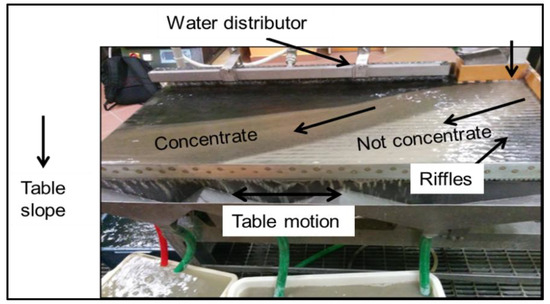 The wet shaking table (also referred to as a shaking table in the present study) method was used for the dressing activity [44]. The experiment was performed on feed weighing 1000 g (Figure 4). After introducing the sample to the feed bar, a continuous flow of water was maintained on the table through a water distributor. The inclination of table, flow of water, and constant shaking of table led to the separation of feed into not-concentrate and concentrate tanks. Following the experiment, solutions containing light and heavy samples were filtered separately using a vacuum filter and Whatman filter papers of diameter 24 cm. These samples were dried in an oven at 80 °C for 6 h to 24 h to remove moisture (until constant weight). The dried samples were weighed and quartered to obtain representative samples for analysis. These representative samples were analyzed for the concentrations of elements (geochemical analysis) and mineralogy (described in Section 2.5.1).