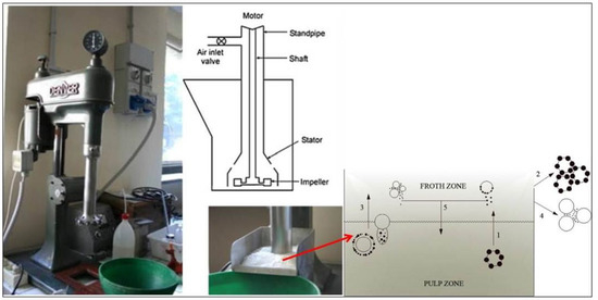 The extractive waste samples were treated using a self-aerating flotation Denver cell (Figure 5). During the experiments, the slurry was conditioned for two minutes. Following the addition of reagent dosage, the slurry was conditioned again for a period of two minutes. 20 mL of the reagent solution was added for size fraction (0.063–0.16 mm) of the sample weighing 200 g, thus reaching reagent dosage of 1 g/kg. The pH of the slurry was then adjusted to a desired value, followed by conditioning of solution. Air was introduced into the slurry by the pumping action of an impeller. The air flow rate was controlled by the inlet valve and was correlated to the impeller speed, which was kept at 1500 rpm. The froth developed at the surface of the flotation cell was removed by hand using a paddle. The froth obtained was filtered to obtain a float sample, whilst the remaining slurry in the flotation cell was filtered to obtain a sink sample. These samples were dried and quartered to obtain representative samples, following the same process as in Section 2.5.2. The analysis was performed as explained in Section 2.5.1.