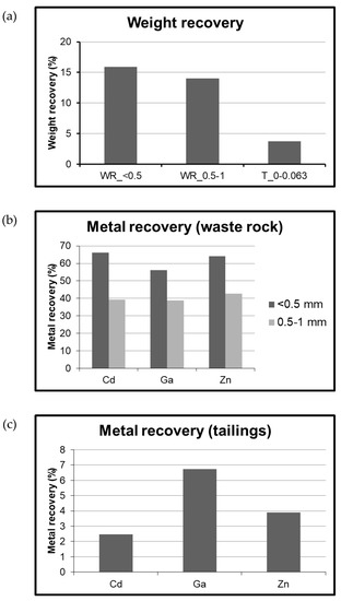 Weight recovery and metal recovery obtained after shaking table experiments. (a) Weight recovery of WR in size fraction <0.5 mm (WR_<0.5) and size fraction 0.5-1 mm (WR_0.5–1) and tailings; (b) Recovery of Cd, Ga, and Zn using waste rock; (c) Recovery of Cd, Ga, and Zn using tailings during shaking table experiments.