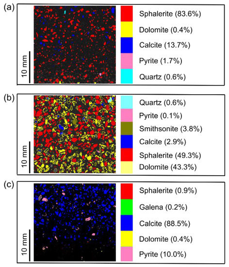 The mineral maps of the heavy sample after shaking table for waste rock (<0.5 mm) showed that sphalerite (83.6%) and calcite (13.7%) were the most abundant minerals. Minor minerals were pyrite, quartz, and dolomite (Figure 9a). Mapping of heavy sample after shaking table for WR (0.5–1 mm) depicted that abundant minerals obtained after shaking table were sphalerite (49.3%) and dolomite (43.3%). The minor minerals were smithsonite (3.8%), calcite (2.9%), quartz (0.6%), and pyrite (0.15%) (Figure 9b). The samples from WR in both size fractions show that the shaking table treatment of WR can lead to beneficial recovery of Zn, present as sphalerite (ZnS) and subordinately in smithsonite (ZnCO3). However, sphalerite was more in heavy samples obtained from WR in size fraction (<0.5 mm) than that in size fraction (0.5–1 mm). This was also evident in recovery of metals summarized in Figure 8. Mapping of a heavy sample of tailings demonstrated that abundant minerals were calcite (88.5%) and pyrite (10.0%); and minor minerals were sphalerite, dolomite, and galena, with total percentage of less than 5% (Figure 9c). These results reveal that the heavy samples from tailings did not show any major presence of sphalerite, which can be exploited economically.