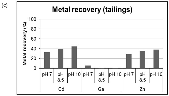 Weight recovery (a) and recovery of Cd, Ga, and Zn after treatment of waste rock (b) and tailings (c) at pH 7, 8.5, 10 and reagent dosage of 1 g/kg.