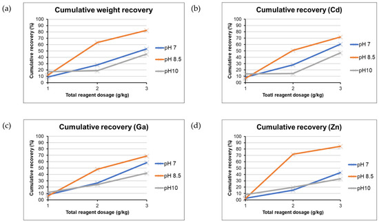 The flotation experiments on the waste rock in the size range fractions 0.16–0.5 mm were conducted using continuous addition of reagent dosage (as shown in Figure 6). Consequently, the results were obtained using cumulative recovery using Equations (5)–(10). It was observed that the values of cumulative recovery in terms of weight (Figure 11a) varied from 9% to 83%. The weight recovery indicated that there was higher recovery obtained with subsequent addition of reagent in the slurry at all the three pH conditions. This has been found in agreement with the previous research done on recovery of zinc from tailings of Pb-Zn mines [63]. Similar trends were observed for variation of cumulative recovery of Cd, Ga, and Zn. The cumulative recovery of Zn varied from 2% to 43%, 2% to 84% and from 8% to 33% for pH 7, pH 8.5 and pH 10, respectively.
