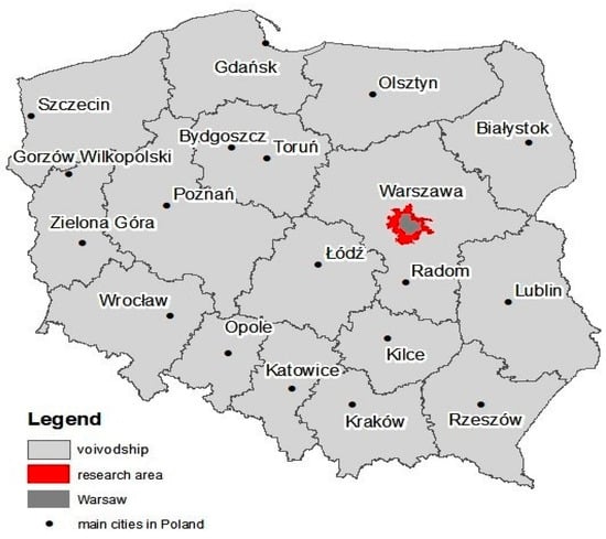 Following analysis of statistical data on building development, a study area was selected which best reflected the problem of urban sprawl at the cost of agricultural areas. The study area includes communes on the administrative boundaries of Warsaw, the largest city in Poland and the capital.