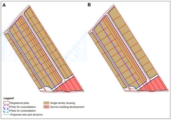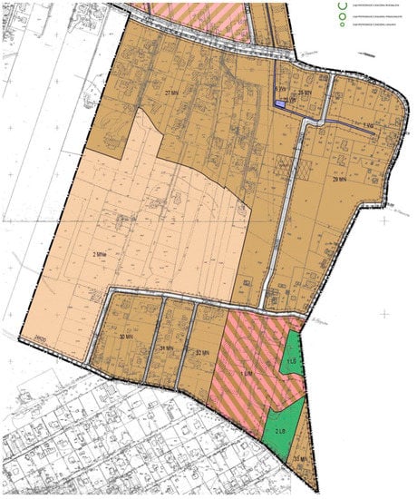 The lack of any information in the local plan regarding the necessity of carrying out a consolidation and effective land division led to a situation in which the owners of plots made an individual consolidation and the secondary division of a number of plots that was different to those proposed in the plan. As a result, the remaining plots, even in the case of merging and dividing, do not allow the possibility of obtaining the plots established in the plan with a plot ratio of about 1:2 (source: authors’ elaboration based on data from geoportal.gov.pl and the local spatial development plan [47]).
