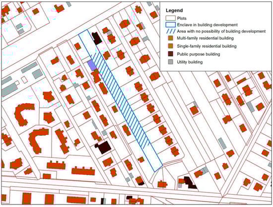 Aside from reducing land value, a lack of action on the part of commune authorities (in terms of preparation of investment land for the introduction of a new function), in many cases, also leads to situations in which the use of land for various purposes is rendered impossible. The lack of a decision on complex regulation of the spatial structure of plots, transportation and technical infrastructure from the perspective of the individual actions of private owners can lead to the occurrence of enclaves in building development. This is particularly evident in areas for which no local plans were passed, and building development is based on decisions about the conditions of building development. Intensive building development, particularly housing, can lead to a situation in which certain sections of plots cannot be subject to division into smaller building plots, and are then developed in accordance with the functions that predominate in particular areas or in accordance with the purpose in the plan. Such a situation can be seen in the area of the Brwinów Commune, located about 30 km to the southwest of the center of Warsaw (Figure 3).