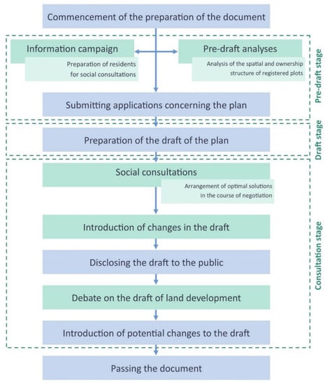 In many European countries, residents are directly involved in the procedure for the preparation of spatial development plans and at a later stage of the implementation of particular investments, e.g., in England, where announcements are published and debates are organized on planned investments involving the participation of residents in neighboring plots; or in Finland, where residents express opinions on investments planned in their neighborhood. Finland, a country that particularly values local community opinion, also has other solutions, i.e., creating groups of stakeholders that cooperate with the architects of plans [54]. Geographical Information System (GIS) tools are also commonly applied for social diagnosis of the quality of space in the form of bottom-up action (bottom-up GIS) and participatory GIS [55,56]. In many European countries, social participation has a practical aspect characterized by negotiation, e.g., in Spain, where communes must reach an understanding with landowners in reference to planned solutions [54]. The participation of residents in spatial planning also has a practical aspect. In France, urban plans are prepared, constituting an instrument of urban planning negotiation with residents for the purpose of preparing a draft development plan for a given area [54]. The provisions of such drafts are considered in prepared spatial development plans [57].