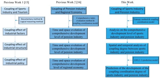 In this paper, to explore the current situation and future trend of the sports and pension industries, the evaluation system of the coupling and coordination development of the sports and pension industries is established by applying the theory of industrial integration. The entropy method and coupling coordination model are used to analyze the coupling and coordination relationship between the sports and pension industries, based on the panel data of 11 provinces and cities in the Yangtze River Economic Belt in 2013–2017. Furthermore, the coupling coordination relationship between the two industries in the region in the next five years is predicted using the grey model (1.1), i.e., GM (1.1) model. This paper intends to apply the theory of industrial integration to the research on the coordinated development of the sports and pension industries and measure and study the relationship between the coupling degree and coordination degree, so as to provide new methods and path choices for the research and design of the coupling development of the sports and pension industries, and to provide reference for the development of the sports and pension industries. The comparison of this work with previous works [21,22] is shown in Figure 1.