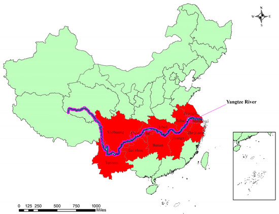 The region of 11 provinces and cities in the Yangtze River Economic Belt (in red).