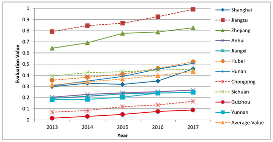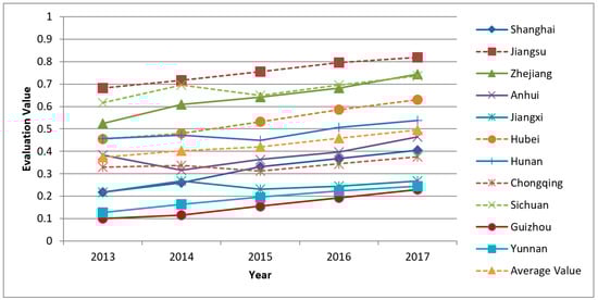 Evaluation values of the sports industry in 11 provinces of the Yangtze River Economic Belt.