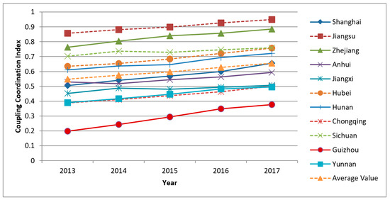 In this paper, the coupling coordination index formula was used to calculate the coupling coordination index of the sports and pension industries of 11 provinces and cities in the Yangtze River Economic Belt of China (Figure 5) based on the obtained coupling degree and comprehensive evaluation value. The coupling coordination stage of each province and city in the Yangtze River Economic Belt was obtained according to the classification standard of the coupling coordination degree. Figure 5 shows that the coupling coordination degree of the sports and pension industries in the Yangtze River Economic Belt has increased from 0.548132 in 2013 to 0.65486 in 2017. The coupling coordination of the two industries increased steadily year by year, but the evolution and promotion speed was relatively slow. The coordination relationship was between bare coordination and primary coordination.