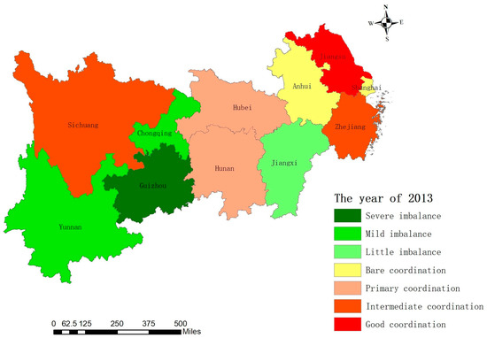 Spatial differences of industrial coupling coordination between 11 provinces and cities in the Yangtze River Economic Belt in 2013.