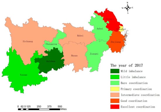 Spatial differences of industrial coupling coordination between 11 provinces and cities in the Yangtze River Economic Belt in 2017.