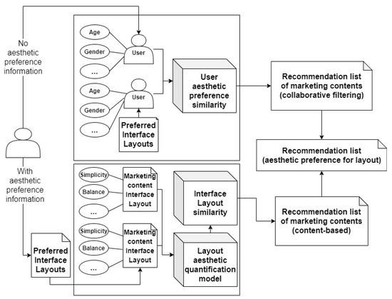 - Phase II, Recommendation list generation based on aesthetic preference for layout. User aesthetic preferences for layout are used to generate a list of marketing recommendations. By using the layout aesthetic quantification method and aesthetic preference similarity method, we calculate similarities between layout designs and the layout aesthetic preferences between users, respectively. Modified content-based and collaborative-filtering methods are combined to generate a recommendation list based on layout aesthetic preference.