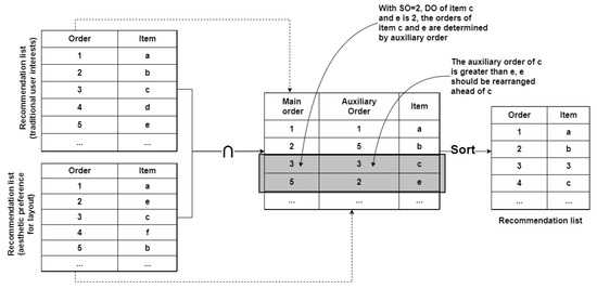 In the previous section, two recommendation lists and were generated using traditional user interests and aesthetic preference for layout, respectively. The final recommendation result should satisfy both users’ needs for traditional interests and aesthetics preferences for layout. The rearrangement involves merging of the two recommendation lists, assigning main and auxiliary orders for items in a merged list, and sorting of the list, a typical process of the rearrangement is illustrated in Figure 3.