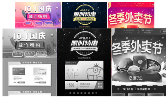 Most of the mobile marketing recommended content interfaces are brightly colored, while colors are rendered differently through devices. To avoid the impact brought by the differences in color rendering, we use an image batch processing tool called ImageMagick to gray out all the interface images we collected with our web crawler. A sample of the comparison of interfaces with colors and grayed out is shown in Figure 5. A total of 6000 images of mobile marketing content interfaces are collected. The data covers 18 product categories, shopping festivals, and marketing activities. Of them, 1042 are removed due to the loss of layout information in graying out the image, and 2387 of them are removed due to image object detection algorithm failure. The remaining 2571 samples are used in our experiment.