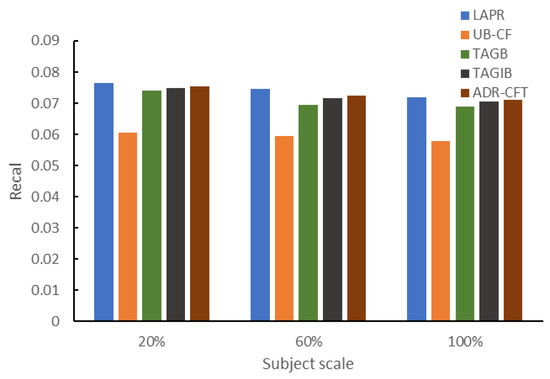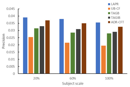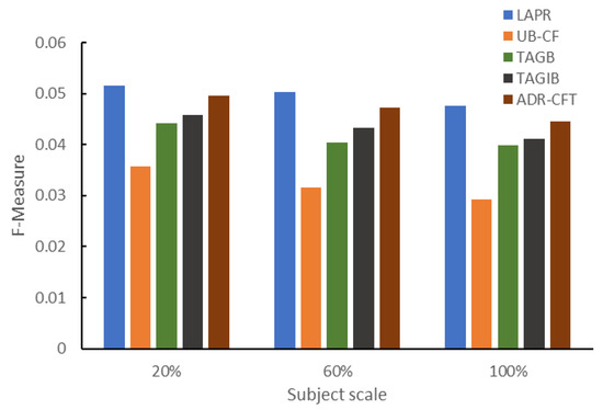 To facilitate the training process of the four classical methods and the process of recommendation lists generation based on traditional user preferences in LAPR, we obtained the records of purchases, searches, favorites, and other activity data of the past year through the social network and e-commerce platforms of the subjects. A total of 7653 pieces of data related to the interaction on mobile social networks of our subjects to marketing contents (including reposts 3951, likes 2649, and comments 1053) were added to our data sets. Another 2747 search and browsing records and 3386 favorite records from m-commerce platforms were added to our data sets. And 149,639,105 data records related to Tencent search ads from KDDCUP were used to readjust the training process. Before the training stage, we made 60 recommendations to 200 subjects and collected 12,000 feedback data to train LAPR. In the formal experiment stage, recommendations on different subject scales were made 10 times, and 5400 pieces of data were collected. The ratio of the size of training to test sets was 7:3.