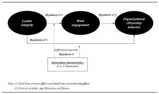 Spector and Fox [10] argued that when an organization and its leaders highly prioritize developing a good ethical and moral climate, the long-term well-being of both individuals and the organization is improved. Workers thus feel happy and become productive laborers, demonstrating that the importance of a fair climate and leaders’ behaviors in an organization cannot be overemphasized. A recent meta-analysis also revealed that employees’ assessments of the integrity of their leaders was clearly associated with the satisfaction, commitment, confidence, and the performance of the employees [11]. Despite the importance of integrity, however, little is currently known about how leader integrity is related to secondary responses—a connection that requires in-depth understanding, because employees in the foodservice industry in particular have significant social interactions with their leaders [12]. Studies of the relationship between leader integrity and an organization’s members have, to date, mainly been conducted in terms of business administration. According to the theory of cohorts, common values and opinions can be formed among the people in a cohort by experiencing and growing from specific events at the same time and through common levels of emotional development [13]. Managers in an organization must therefore learn the values and patterns of behavior of members of each generation through trial and error to effectively manage them [14]. According to Porath [15], a lack of proper communication due to differences between generations can cause an increase in interpersonal interaction problems within an organization and these issues require responses at the organizational level [16]. This study therefore examines the roles of moderate based on employees’ generations. In Korea, most workers within organizations are currently from Generation X, while Generation Y is now entering the labor market; together, they comprise the majority of the modern foodservice industry [17]. This study will examine whether leader integrity, as perceived by subordinates, enables the establishment of a strong interactive exchange relationship between a leader and those subordinates. The study will also investigate the importance of a leader’s integrity in promoting employees’ work engagement and organizational citizenship behaviors, with the aim of moderating empirical evidence of generational differences.