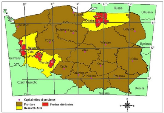 To achieve the established research objective, i.e., to assess soil properties in the selected organic farms, 55 organic farms were studied in 2016. All the farms had been subjected to a system of control and certification of the certification body, based on inspections performed in 2015. They met the requirements of the EC regulation No. 834/2007 of 28 June 2007 titled Organic Production and Labeling of Organic Products and Repealing Regulation (EEC) No. 2092/91. All farms were converted to conduct organic production. The studied farms were located in Poland in the Dolnośląskie (17), Lubuskie (13), and Warmińsko-Mazurskie (25) provinces (Figure 1).