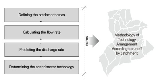 In order to predict the amount of soil runoff, the target site was first classified into a set of catchment areas using the Arc GIS Program. After the amount of rain falling on the site was calculated, the discharge characteristics of the individual catchment areas were identified [18]. Finally, the optimum scale and arrangement of disaster prevention technology was proposed by separating the catchment areas into zones based on the relationships between them to define the final catchments. Data on the amount of rainfall and the local soil characteristics are important when calculating the soil discharge properties, this study utilized three-year monitoring data for Busan City and Sejong City as no suitable measurements were available for Namhyeon-dong [19]. Appropriate disaster prevention technologies and procedures that could be deployed to reduce the impact of soil disasters and minimize the damage caused in residential areas across each catchment area were then determined and their potential impacts examined. The discharge of soil from the catchment was quantified based on the RCP 8.5 projections. The study scheme is shown in Figure 2. The research is divided into four stages: Catchment classification, determination of the design capacity, prediction of soil runoff and design proposals.