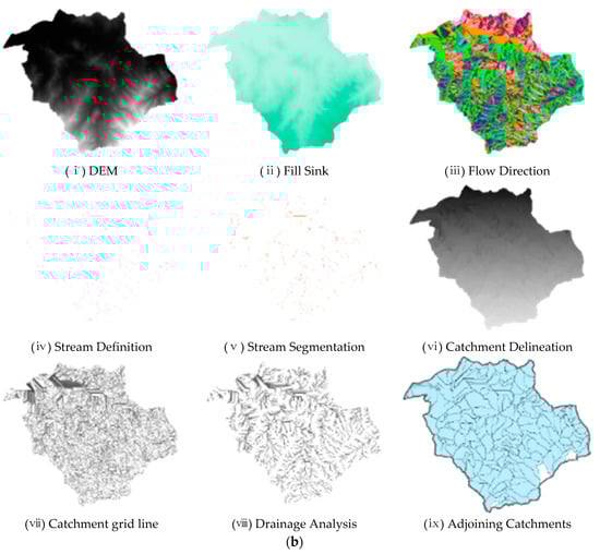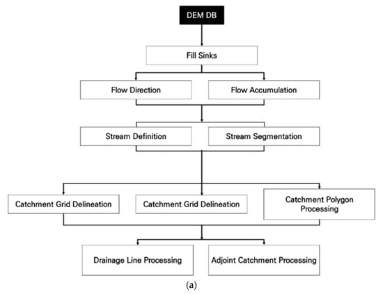 Reliable prediction of river flow in catchment is very important due to its complex nature, particularly highly non-linearity [29]. Based on the Digital Elevation Model (DEM), which represents terrain’s surface produced by 3D graphic tools, the data extracted from the contour lines in each of the catchments in the study site was assessed using a hydrologic analysis methodology. After that, the direction of the water flow across the catchment area was assessed based on the slope [30]. The ArcHydro plug-in of the ArcGIS program [31] is mainly used for hydrology, but here, we used it to analyze the effects of rainfall in mountainous regions [32]. For the DEM, the minimum unit (cell size) of Raster data was set to 2.5 in order to analyze section lengths of the unit grid of elevation data that were larger than the average section length of buildings in the area [33,34]. Figure 3a shows the algorithm chart for the ArcHydro plug-in used in this analysis.