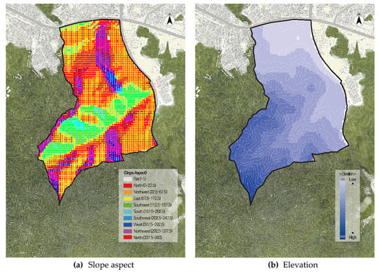 Slope aspects (a) and elevation (b) of the Namhyeun-dong catchment areas (unit: m).