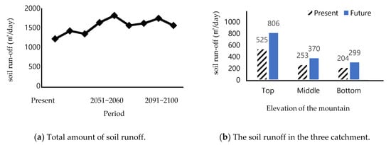 Changes in the soil runoff according to the RCP 8.5 climate change scenario: (a) The soil runoff with time; (b) comparison of the current and predicted soil runoff for each of the three catchment groups.