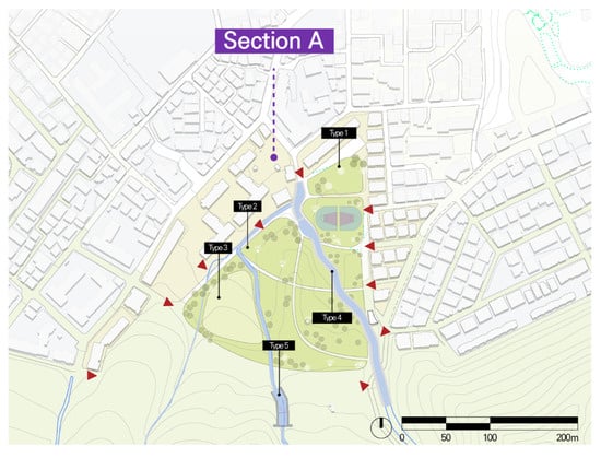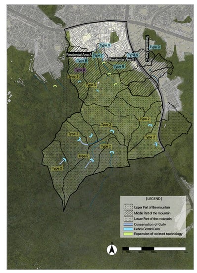 Figure 8 shows the masterplan where all the proposed technologies have been implemented and installed. Based on the analysis of the soil discharge and the characterization of the catchment areas according to the site survey, elevation and slope of the mountainous areas conducted for this study, the Namhyeon-dong catchment was classified into three main zones, namely upstream, midstream and downstream. The appropriate prevention technology recommended for each environment is listed in Table 4. Since the areas that would potentially suffer from the greatest damage in the event of a major flood are largely concentrated in the downstream zone, the residential areas at the foot of the mountain should receive the most attention when designing appropriate subdivisions of the space based on the characteristic soil movement experienced in such areas.